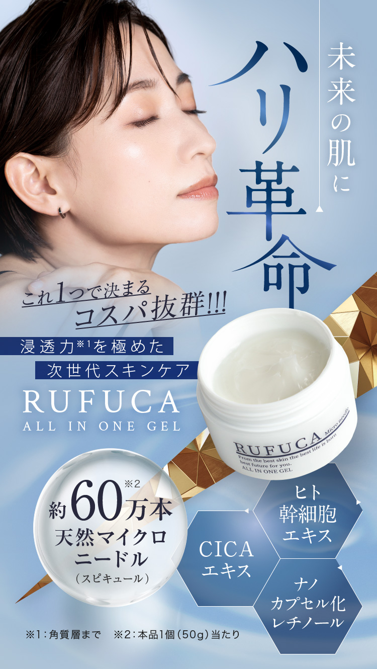 RUFUCA(ルフカ)は、天然マイクロニードル(針)を配合した 次世代型オールインワンジェルです。50g入りで、毎日のスキンケアをこれ1つに凝縮。 少しチクチクとした使用感がありますが、それは美容成分を角質層までしっかり届けるため。 手応えを感じながらケアできる、新しい発想のスキンケアアイテムです。