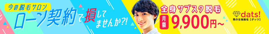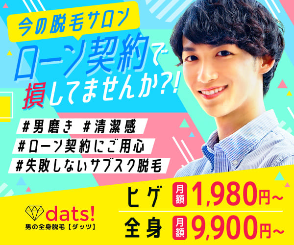 男の全身脱毛dats!【ダッツ】は、20代〜50代の男性に特化したヒゲ脱毛・VIO脱毛・全身脱毛の専門店です。最大の特徴は、スポーツジムのように通える月額定額制のサブスク脱毛プラン。これまで主流だった高額な回数券やローン契約とは違い、必要な期間だけ無理なく通える新しいスタイルを採用しています。